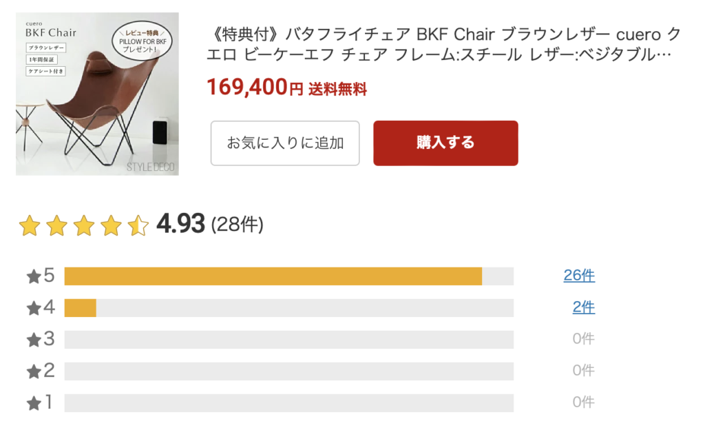 - CUERO BKFチェア(バタフライチェア)。価格は約17万円(税込)の高級な本革製チェアです。