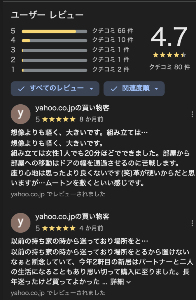 公式サイトにはレビュー情報が存在していなかったため、Google検索と楽天市場のレビュー情報を見てみます。レビュー数「28件で4.93」「80件で4.7」と高い評価だと思います。またレビューを読むと、大きさや革の固さに言及されている方がいました(固さ対策は後述します)。