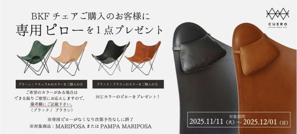 本章のタイトルにもなっている「CUERO BKFチェア(バタフライチェア)」が本記事で紹介したい椅子になります。早速、公式HPから写真と情報を拝借しつつ商品紹介したいと思います。